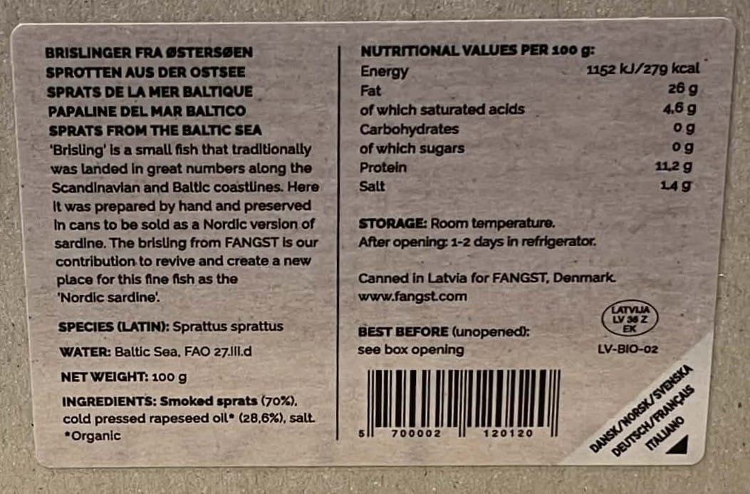 Reykt sardína (70%), kaldpressuð repjuolía* (28,6%), salt.