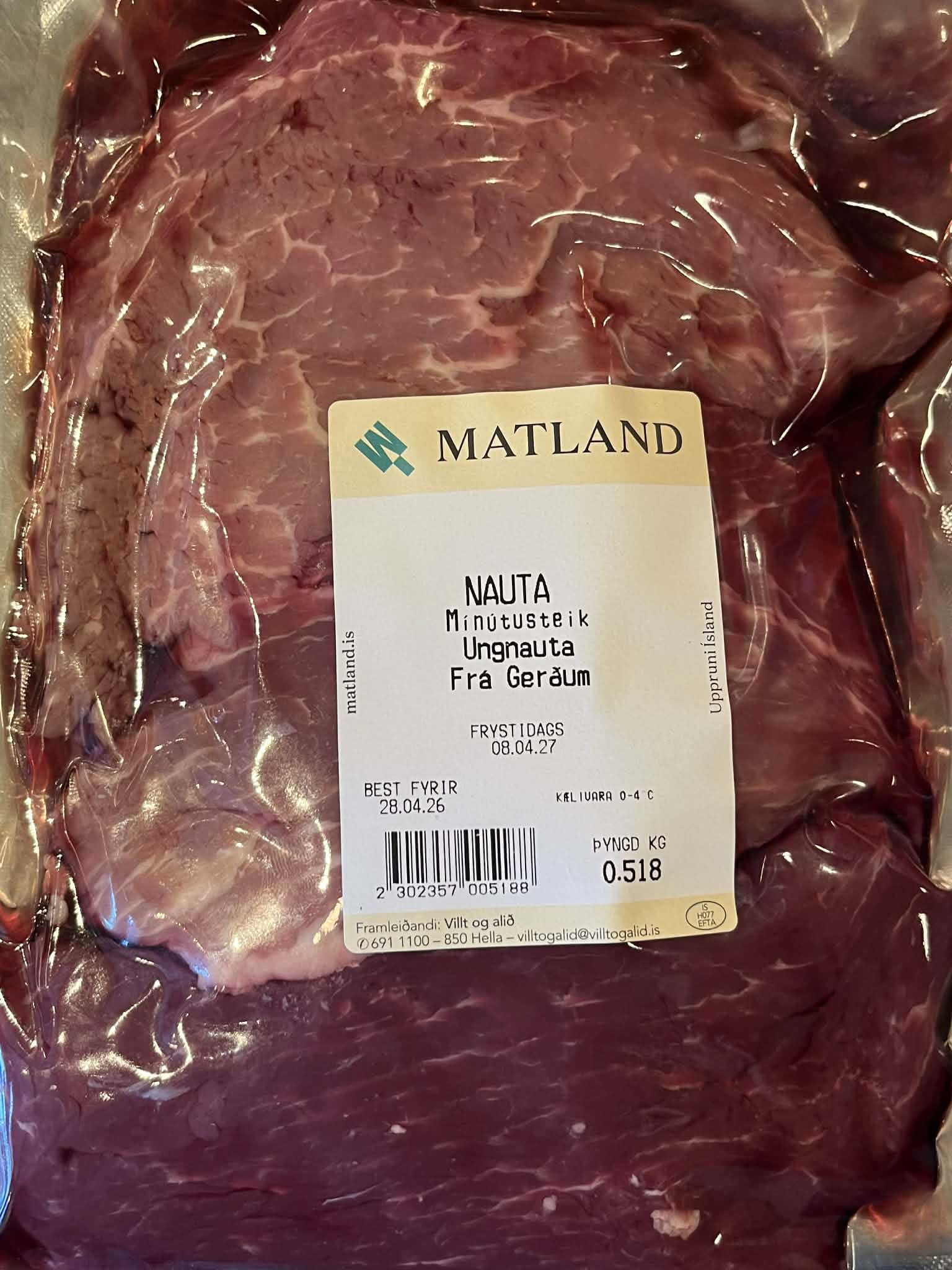 Innihald: Mínútusteik af Angus frá Gerðum.