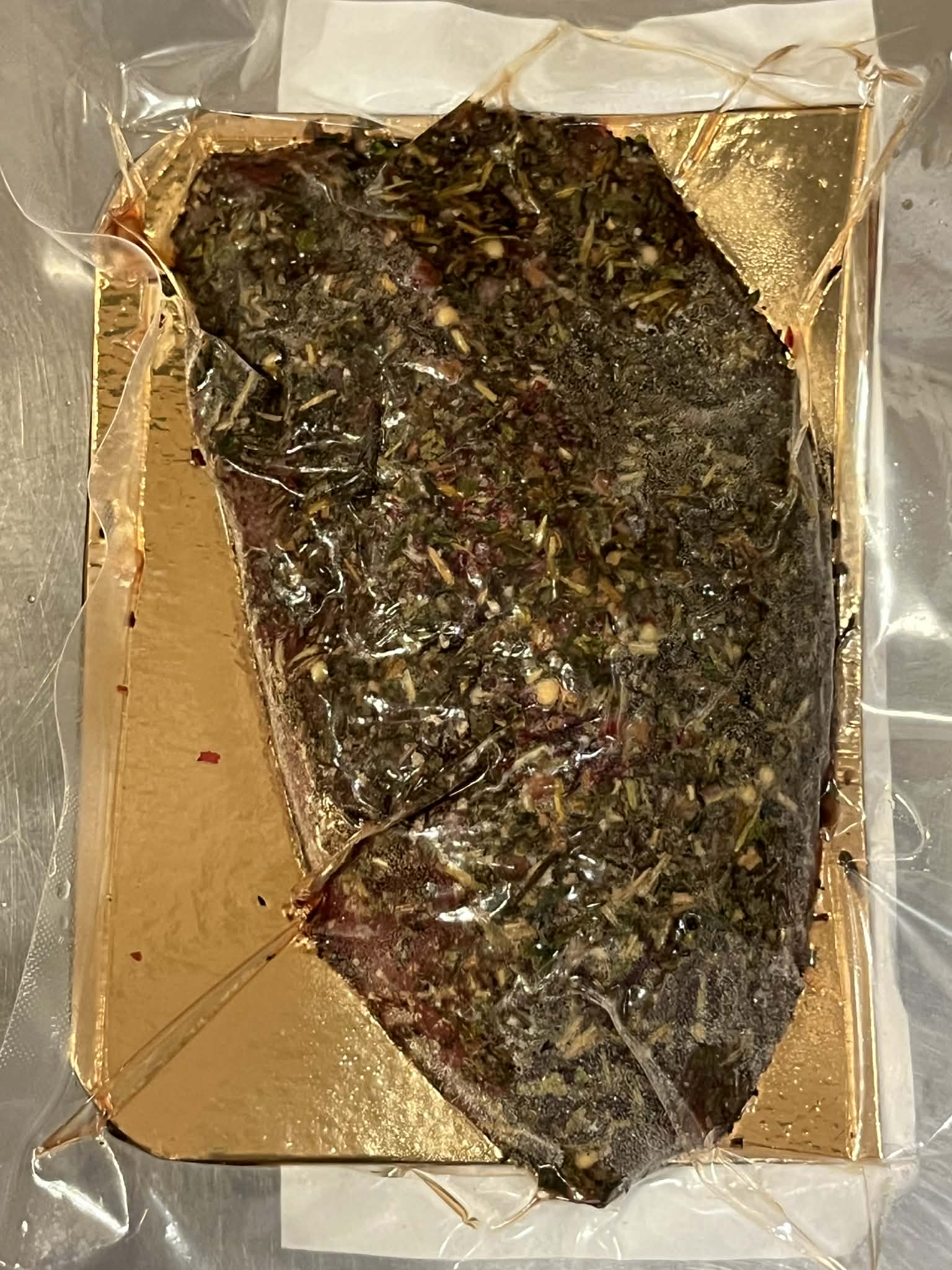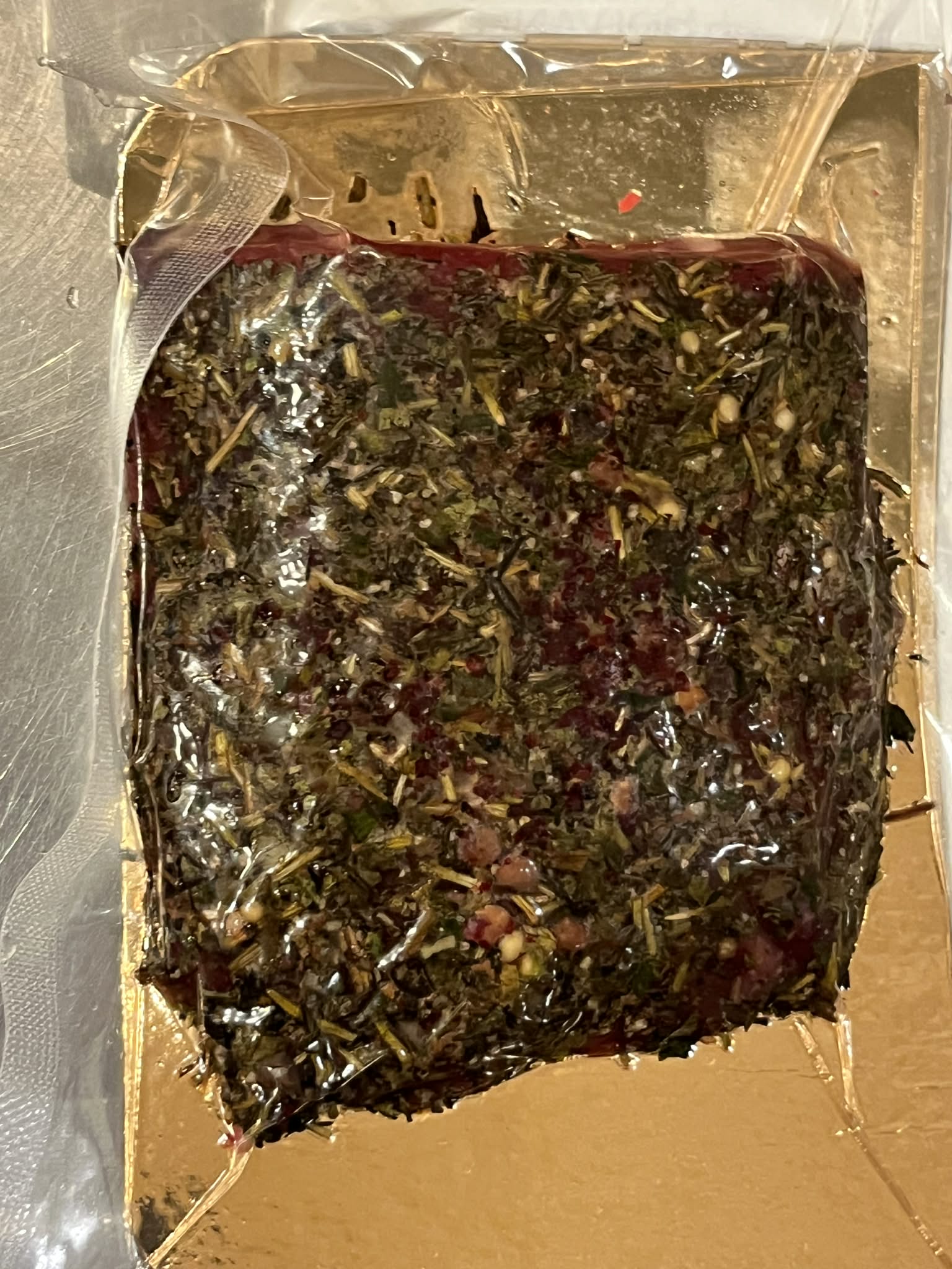 Grafinn ærvöðvi, lífrænt vottað kjöt frá bænum Sölvanesi í Skagafirði. Í kryddinu er m.a. sinnepsfræ, basilika, timjan, rósmarín, svartur pipar, oregano, dillfræ, rósapipar og villijurtir.