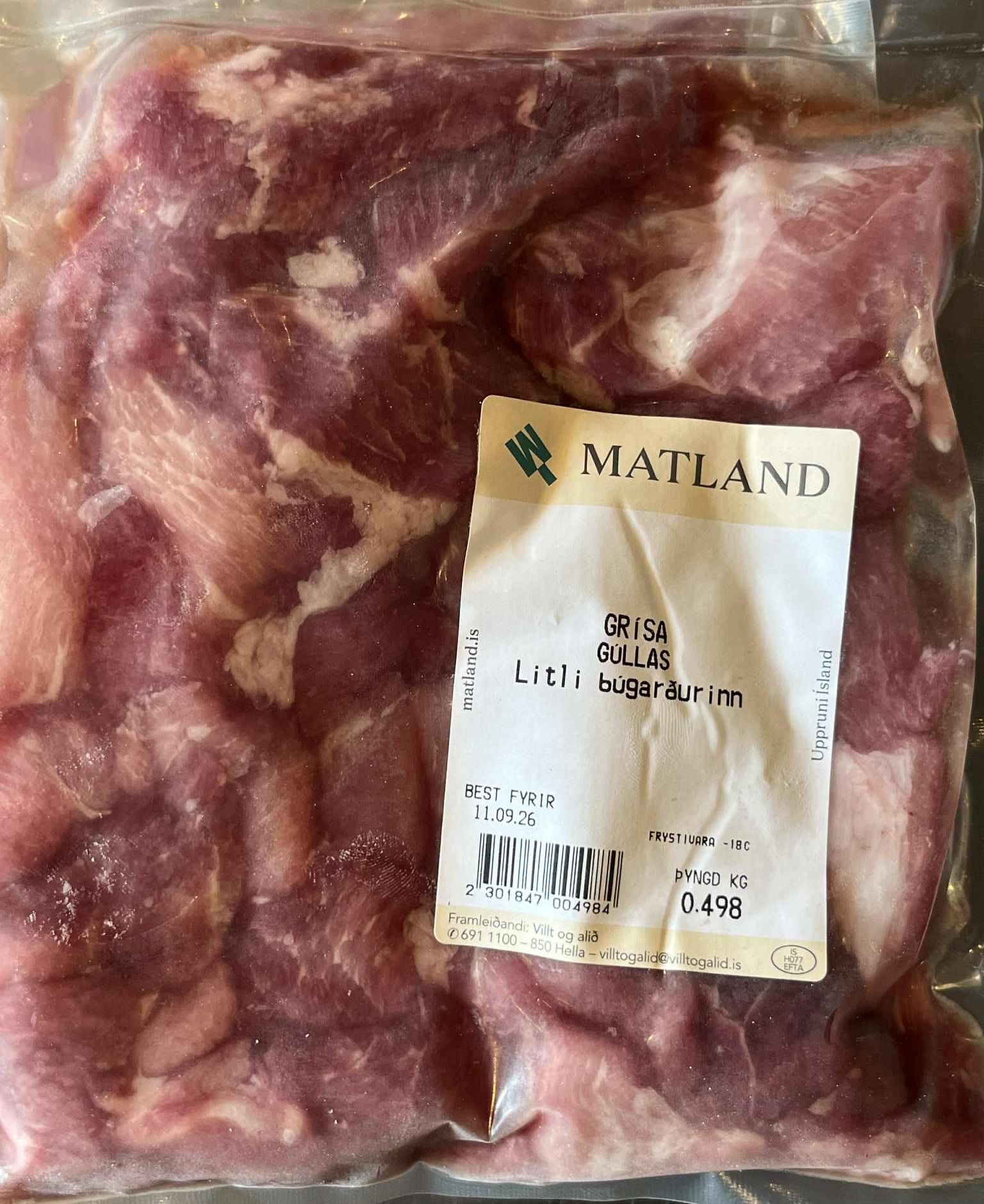 Grísagúllas frá Litla búgarðinum á Hlemmiskeiði. Kjöt af grísum sem fá að valsa um í beitarhólfi þar sem þeir bíta gras og fá að auki íslenskt kornfóður. Kjötið er aðeins dekkra en hefðbundið grísakjöt og mörgum þykir það bragðmeira. Frystivara. Takmarkað magn.
