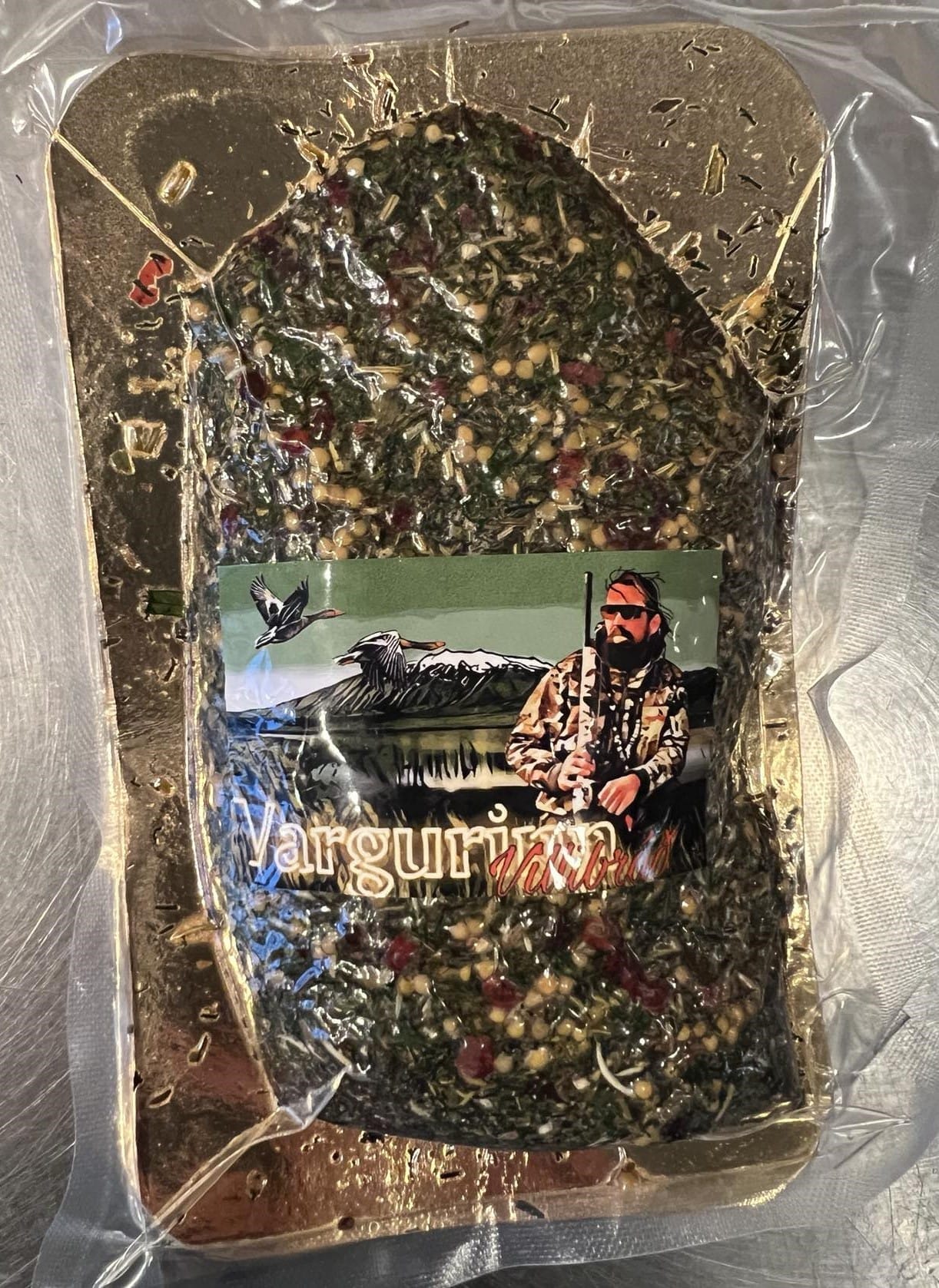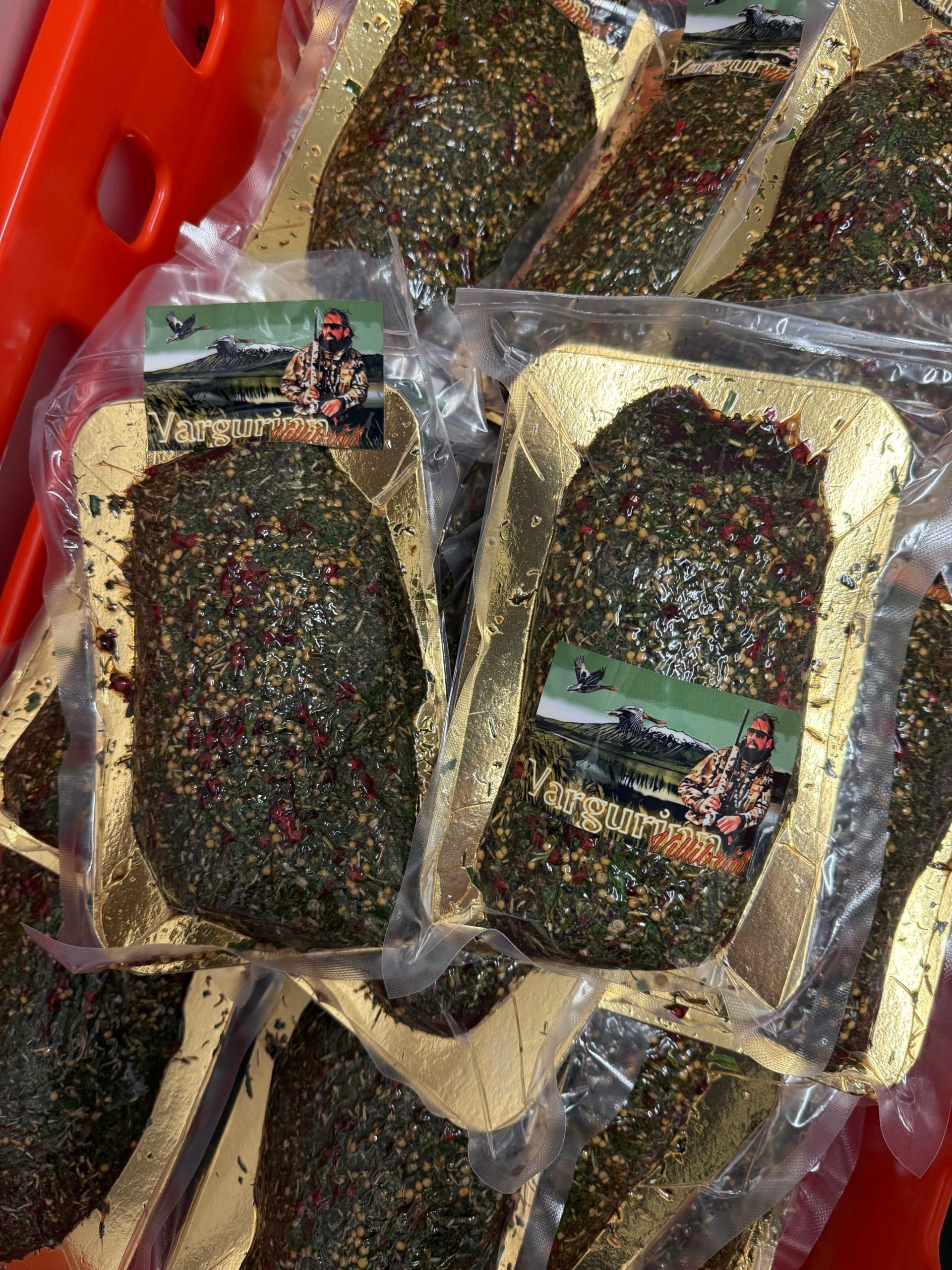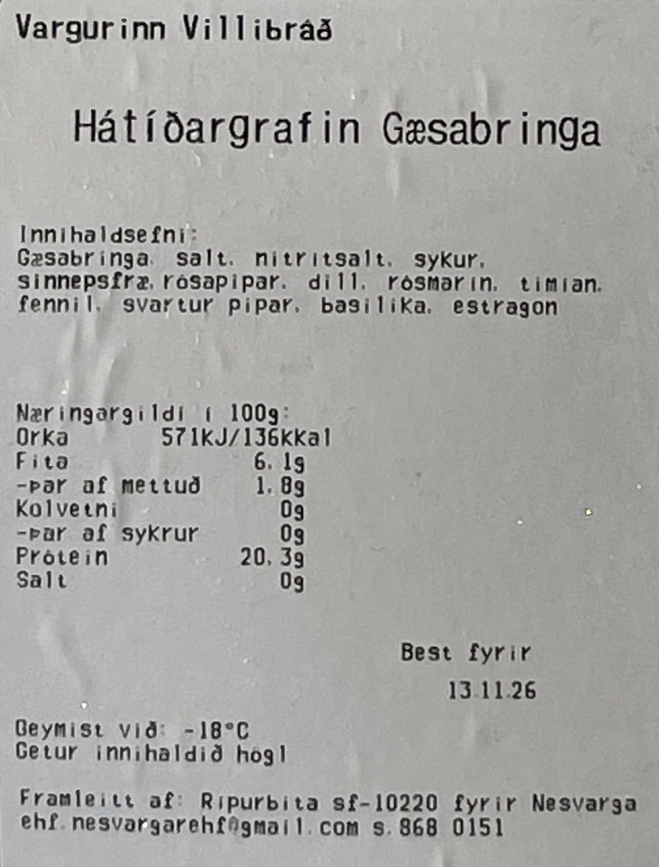 Innihaldsefni: Gæsabringa. Salt, nitritsalt, sykur, sinnepsfræ, rósapipar, dill, rósmarín, timían, fennil, svartur pipar, basilika og estragon.