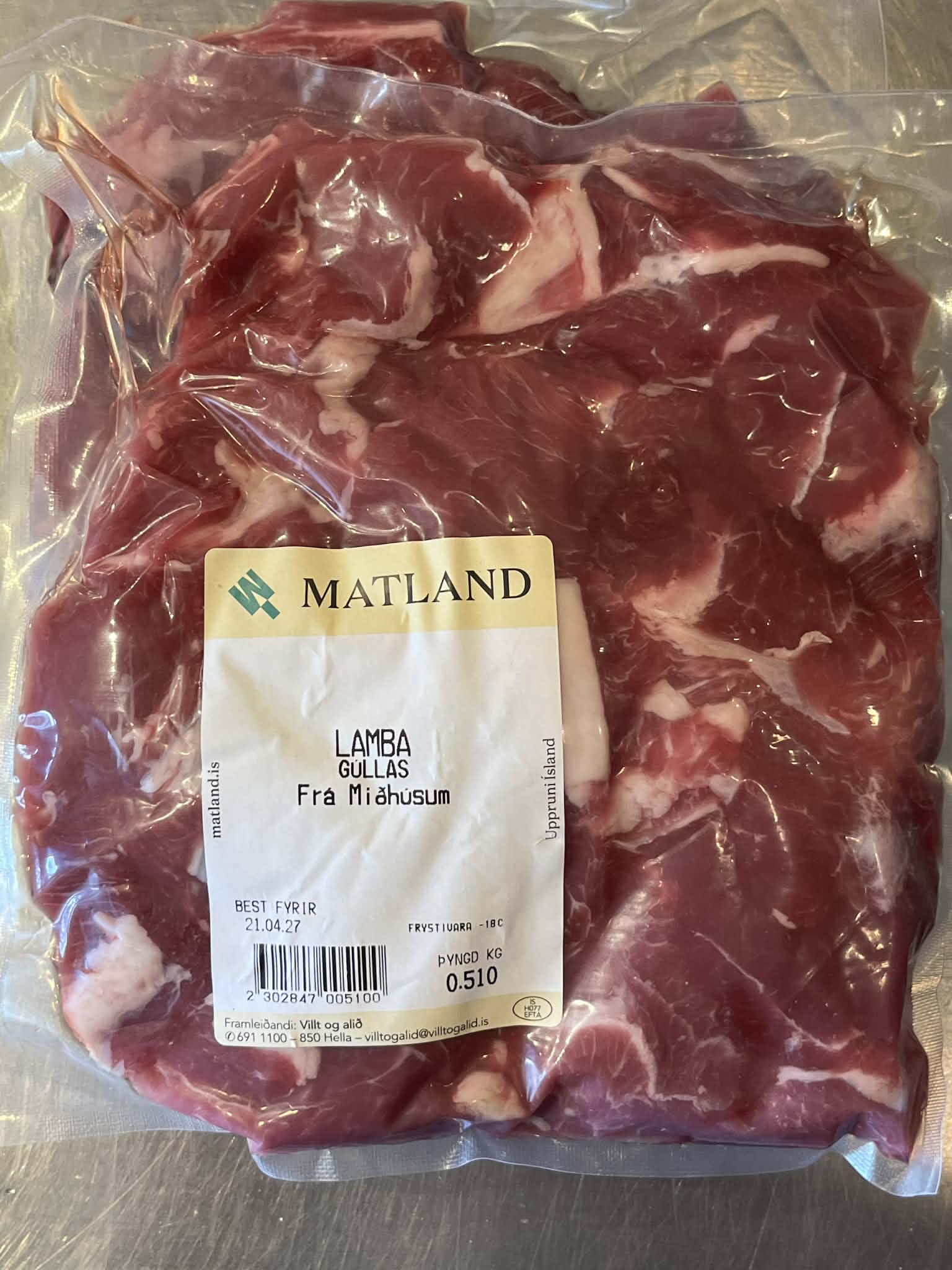 Lambagúllas frá Miðhúsum. Lambakjöt að norðan sem er þekkt fyrir gæði. Kjöt sem fékk að hanga í 12 daga og er meyrt eftir því.