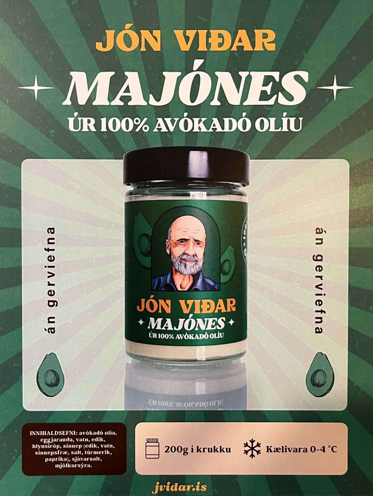 Manst þú eftir sósunni á Skalla? Nú fæst majónesið í henni hjá Matlandi og ber heiti eigandans Jóns Viðars sjálfs. Helstu eiginleikar þess er – fyrir utan ómótstæðilegt bragð að sjálfsögðu – er að majónesið er unnið úr 100% avókadóolíu án allra gerviefna.