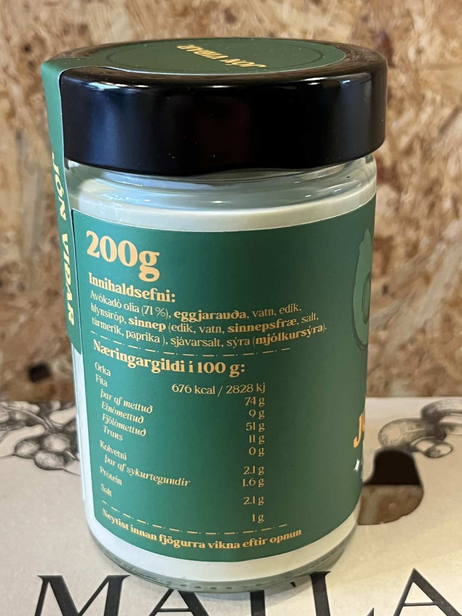 Innihald: Avókadóolía, eggjarauður, vatn, edik, hlynsíróp, sinnep (edik, vatn, sinnepsfræ, salt, túrmerik, papirka), sjávarsalt, mjólkursýra.