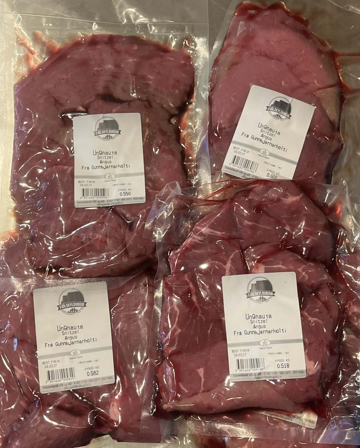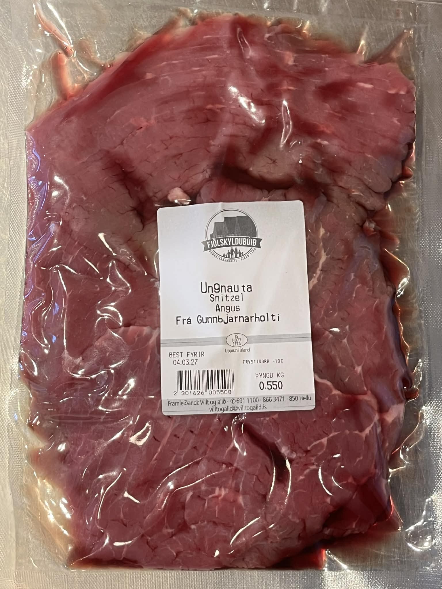Nautasnitsel. Kílóverð: 4.990 kr. Ágætt er að miða við 200-250 g á mann í aðalmáltíð. Frystivara.