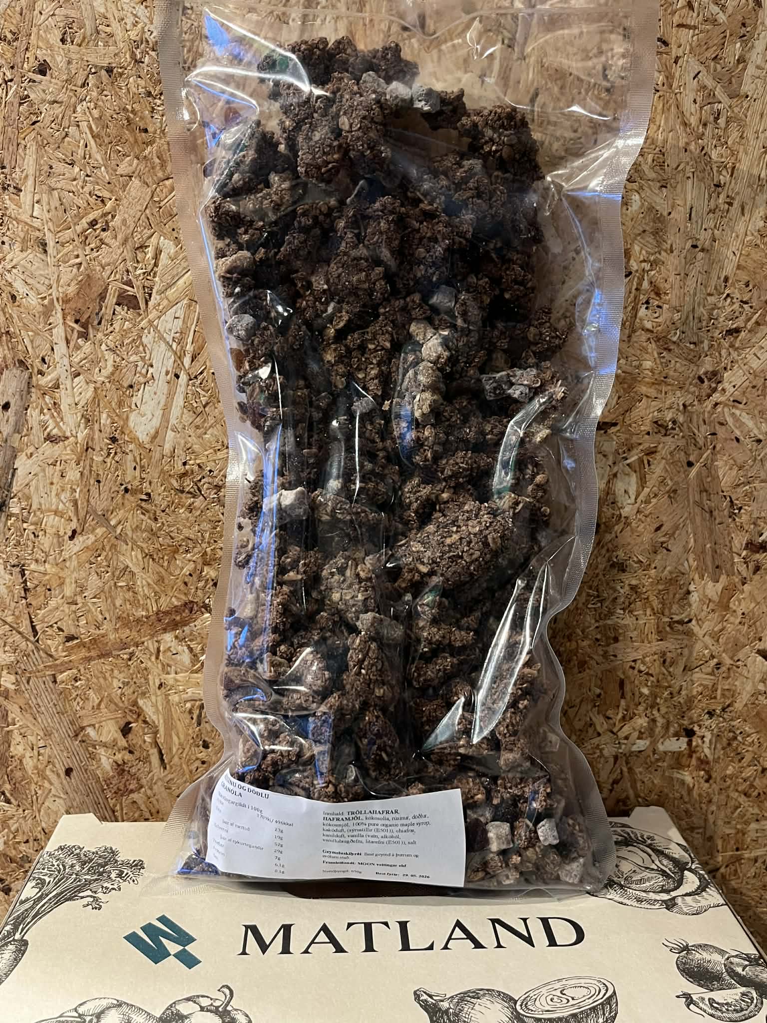 Innihald: TRÖLLAHAFRAR, HAFRAMJÖL, kókosolía, rúsínur, döðlur, kókosmjöl, 100% hreinn Organic Maple Nectar, kakóduft, sýrustillir (E501), chiafræ, kanilduft, vanilla (vatn, alkóhól, vanillubragðefni, litarefni (E501), salt.