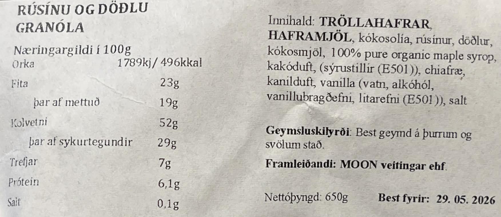 Innihald: Rúsínu- og döðlumúslí / granóla frá Moon veitingum