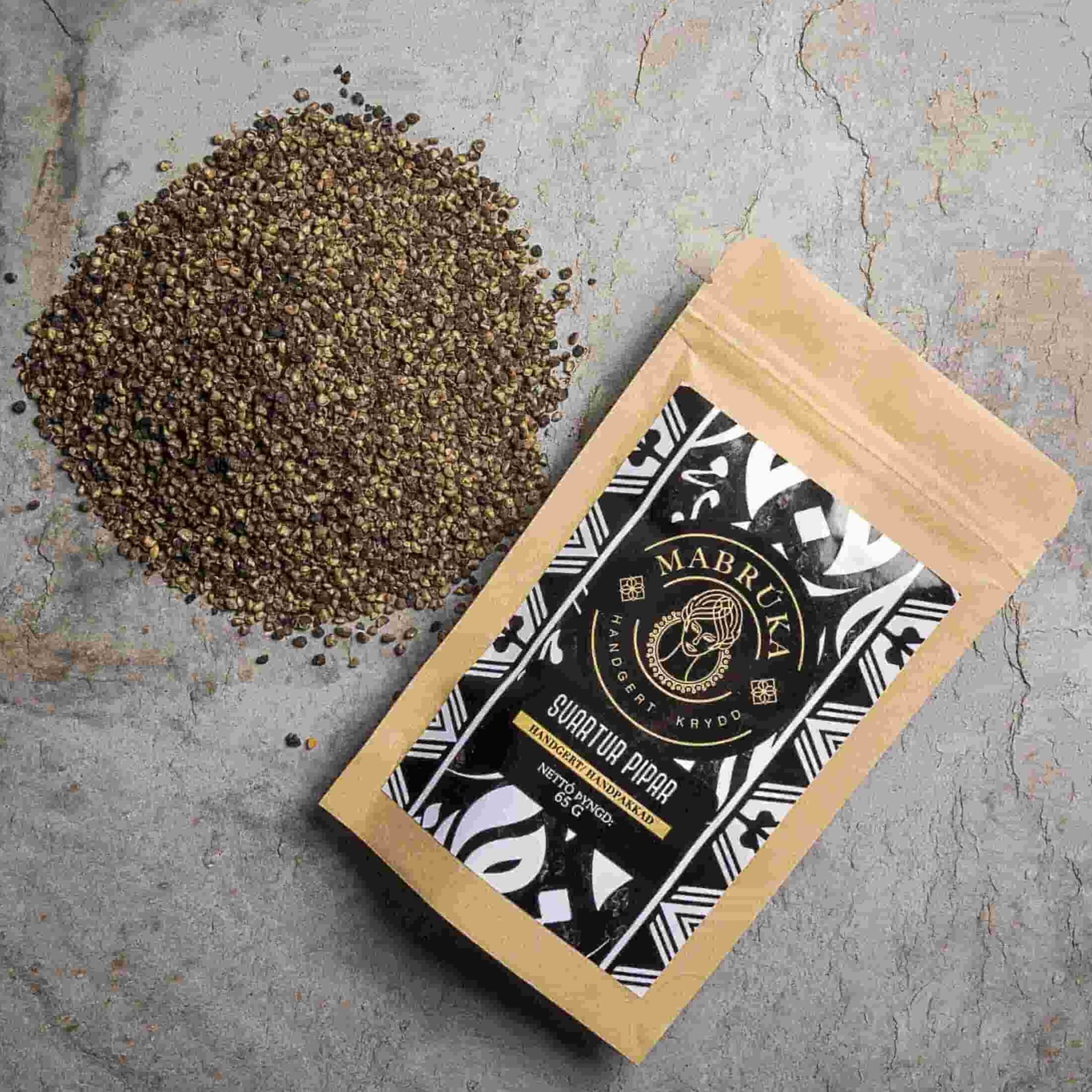 Piparinn frá Mabrúka inniheldur hágæða hráefni frá Túnis. Öll hráefnin í kryddunum frá Mabrúka eru handtínd, skoðuð og hreinsuð og síðan möluð samkvæmt gömlum hefðum. Alls eru 65 g af piparkornum í hverjum pappírspoka.