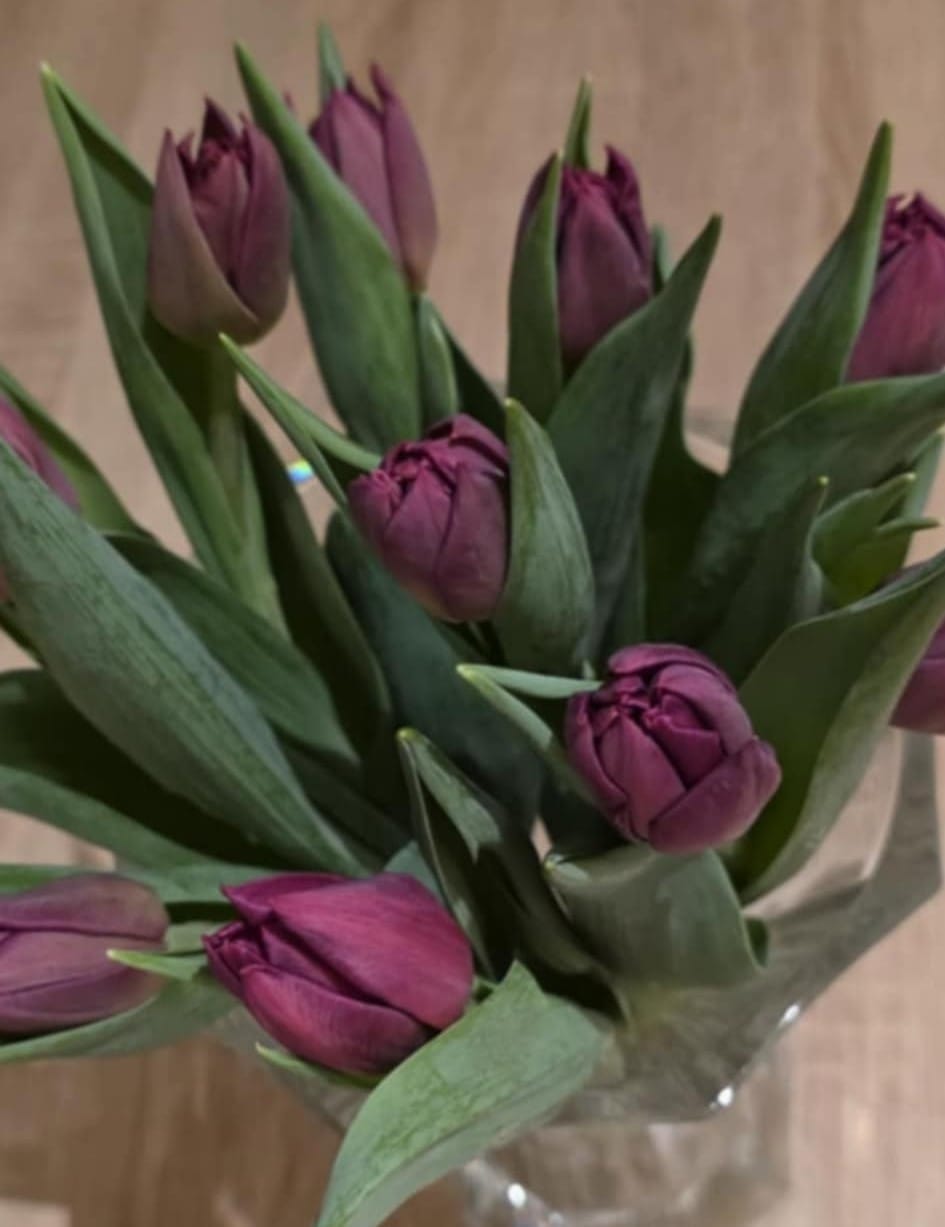 Túlipanar frá Clemens van der Zwet og Elsu Jóhannesdótttur í Stykkishólmi. 10 stykki í búntinu. Fjólubláir tvöfaldir túlipanar. Verð á einu búnti er  2.500 krónur. Fjólubláu túlipanarnir eru ögn minni (fínni stilkar) en þeir túlipanar sem hafa verið í boði síðustu vikur. Nettir og fallegir.