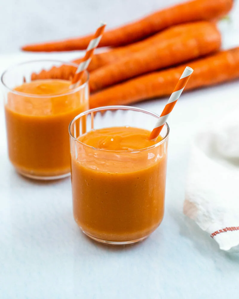 Hér er góð uppskrift af skotheldum gulrótasmúðí sem auðvelt er að mixa saman í blandara. Þetta eru hráefnin sem gera grunninn að meinhollum drykk:
