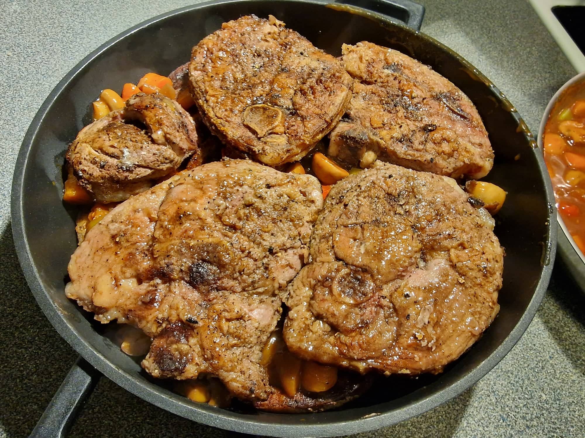 Lambalærissneiðar er hægt að matreiða á fjölbreytta vísu. Hér eru þær í pottrétti með grænmeti. Myndir / Laufey Rós