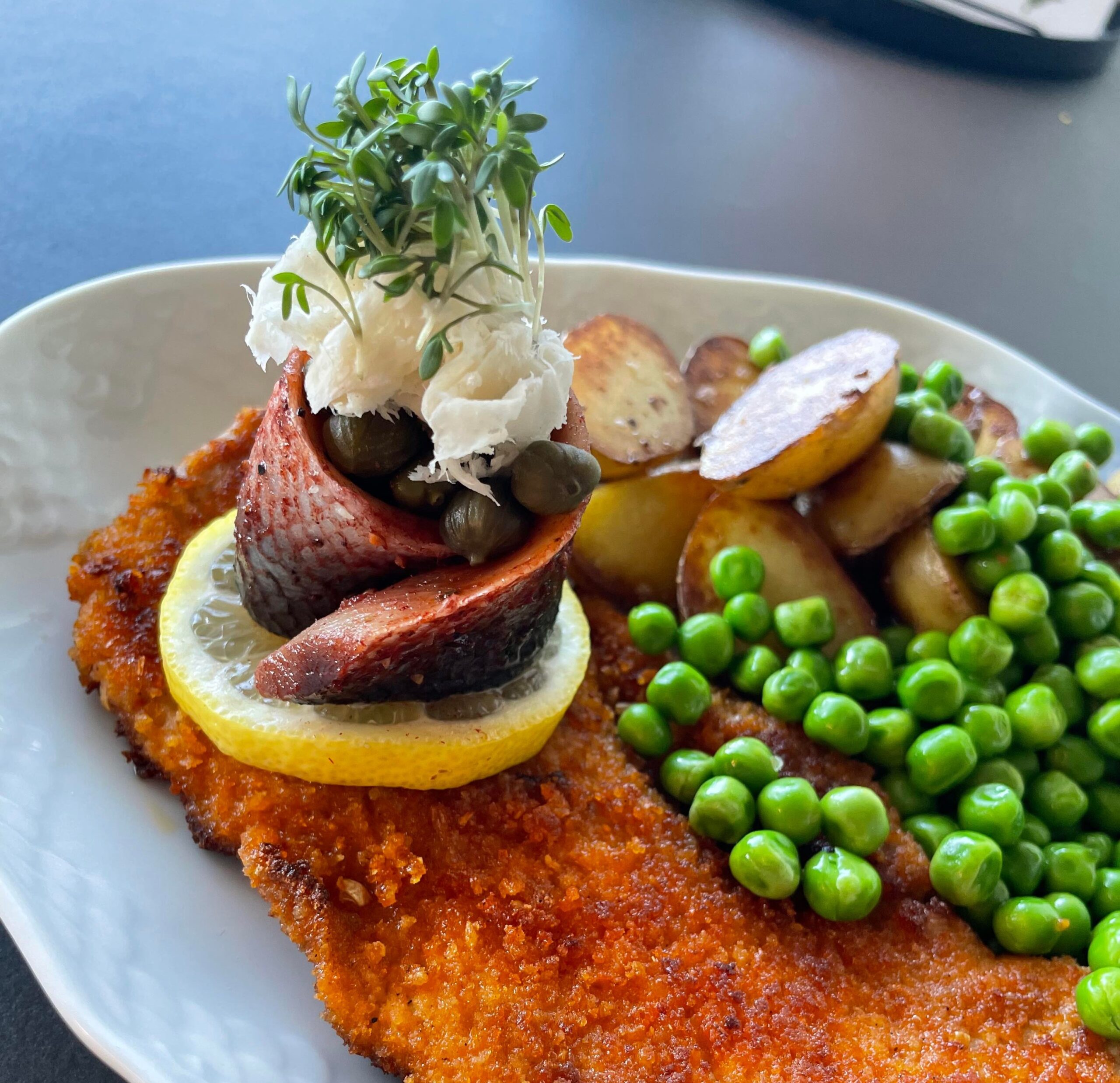 Hér í Kóngsins Köben er snitzelið oft á kvöldmatseðli en snitzel er órjúfanlegur partur af hinu klassíska danska eldhúsi. Hér á Restaurant Tivolihallen, þar sem ég starfa, höfum við haft þann háttinn á að „drengur“ er settur ofan á steikt snitzelið, en hann samanstendur af; sítrónusneið með „Christiansøpigens Sild“, kapers og skrapaðri piparrót, skreyttri með karsasprettum.