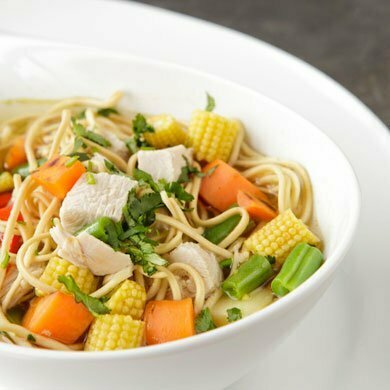 1. Setjið allt nema kalkúnakjöt, núðlur og kóríander í pott og sjóðið í 5 mín.